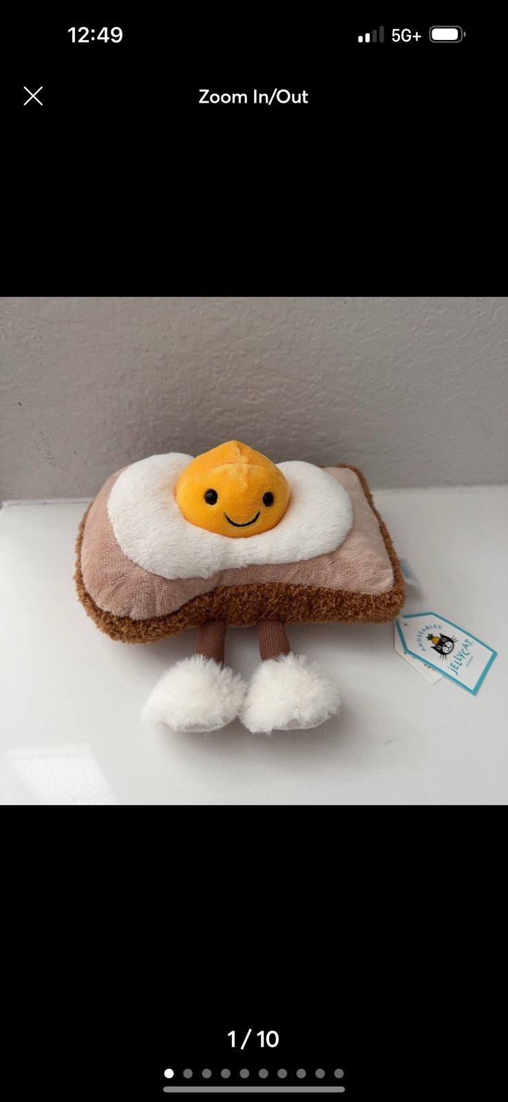 Amuseables Egglantine Egg on Toast is the breakfast of champion cuddlers. A fluffy egg fried sunny side up with bright, smiling yolk sits atop a perfectly toasted slice of bread with textured crust. With fine cord legs and white fluffy slippers, Egglantine starts every day right – from self-care Sundays to meeting Mondays!